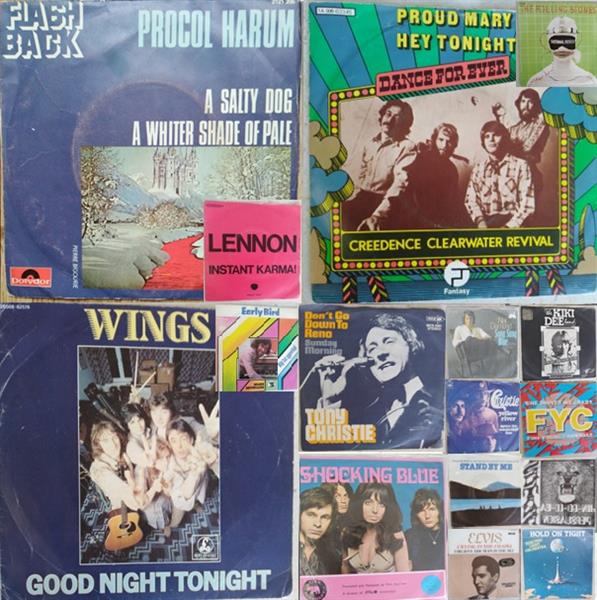 65 behoorlijke -van hoezen voorziene- vinylsingles (met o.a. PROCOL HARUM, (JOHN) LENNON, CREEDENCE CLEARWATER REVIVAL, THE ROLLING STONES, WINGS, ANDRE BRASSEUR, TONY CHRISTIE, NEIL DIAMOND, THE KIKI DEE BAND, CHRISTIE, FINE YOUNG CANNIBALS, SHOCKING BLUE, BEN E. KING, SANTANA, ELVIS PRESLEY, ELECTRIC LIGHT ORCHESTRA, THE GUESS WHO, EURYTHMICS, DEEP PURPLE, e.v.a. ...) met meestal Engelstalige, maar ook met enkele schaars te vinden instrumentale en anderstalige exemplaren.
